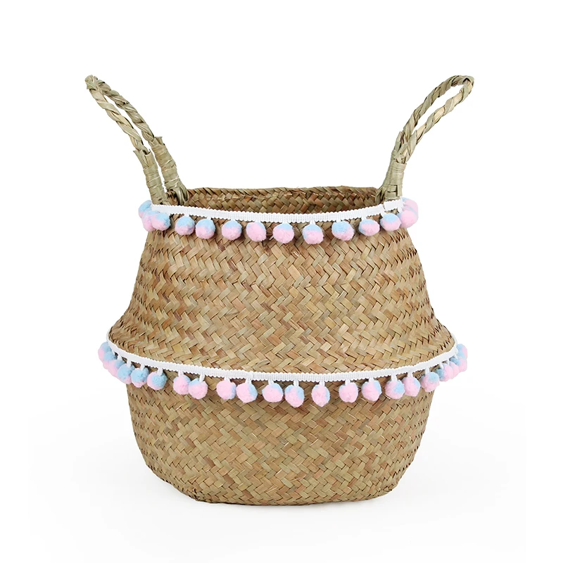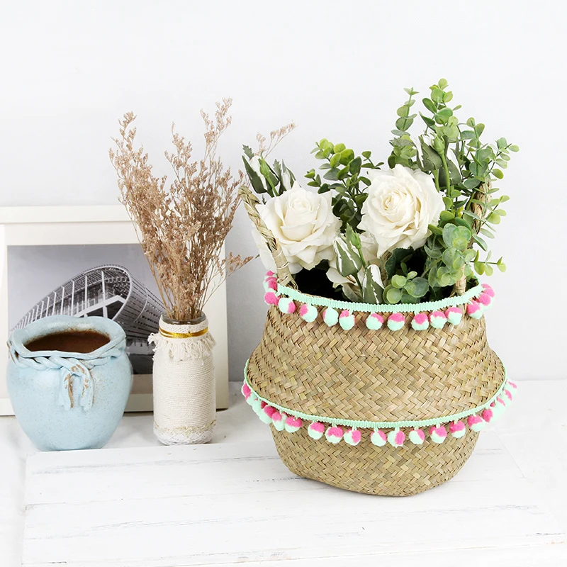 Handmade Wicker Storage Baskets Foldable Laundry Straw Patchwork Rattan Seagrass Belly Garden Flower Pot Planter Basket